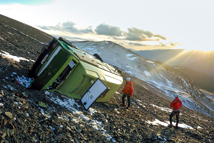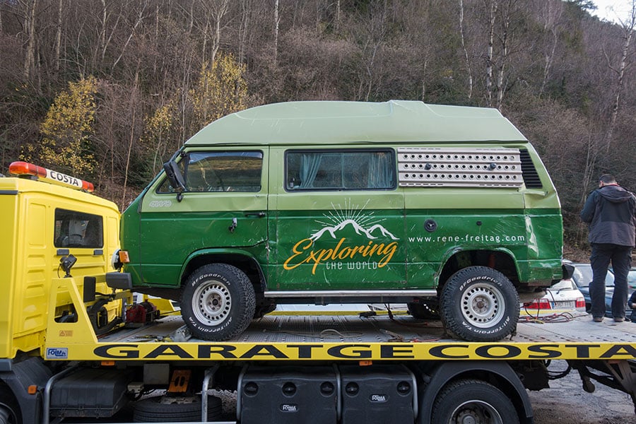 Was bisher geschah: Nach über 15 Monaten on the Road, von Norwegen bis in die Westsahara, unzähligen tollen Momenten und Begegnungen, hat sich „die heile Welt“ innerhalb von 15 Sekunden gewendet – und der Bulli liegt abgestürzt in steiler Hanglage.