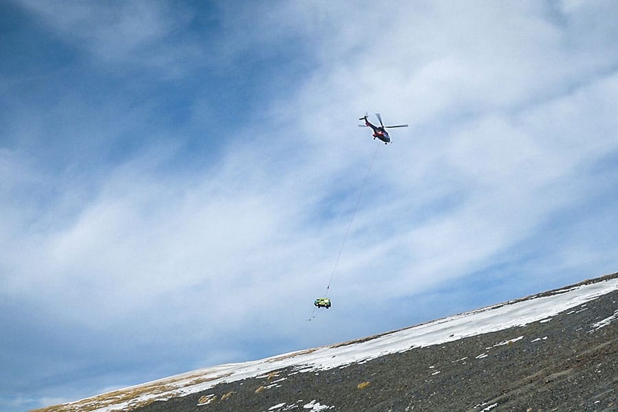 Dann bekam er ein paar Schlingen umgelegt und der große Hubschrauber wurde angefunkt. Kurze Zeit später tauchte er am Horizont auf. Unter ihm baumelte ein 40 Meter langes Seil samt Haken am anderen Ende. Langsam und extrem präzise platzierte der Pilot den Haken über dem Bus.