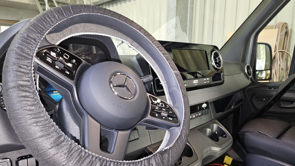 Der Sprinter hat den großen 190-PS-Motor und die Neungang-Automatik, das MBUX-System mit Navi und dem großem Infotainment-Touchscreen, eine Rückfahrkamera und LED-Fahrscheinwerfern. Auf Allrad haben wir bewusst verzichtet – mit dem Schlechtwegefahrwerk meistert der vorderradangetriebene Sprinter die meisten schwierigen Strecken und sollte so den besten Kompromiss zwischen Alltagstauglichkeit und Geländegängigkeit bieten.