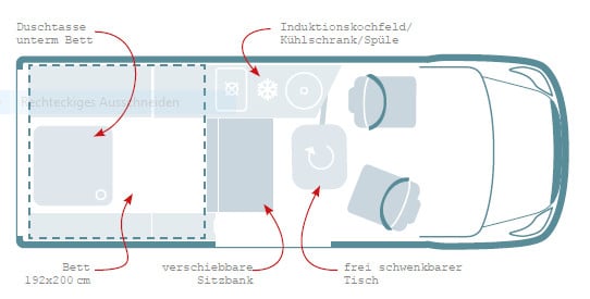 Das Grundriss-Konzept gleicht mehr einem klassischen Campingbus als einem Kastenwagen und überzeugt durch eine bis zu 200 mal 196 Zentimeter große Liegefläche. Auf ein festes Bad verzichtet der Advanstar F, wodurch ein tolles Raumgefühl entsteht oder aber sperriges Sportgepäck transportiert werden kann.