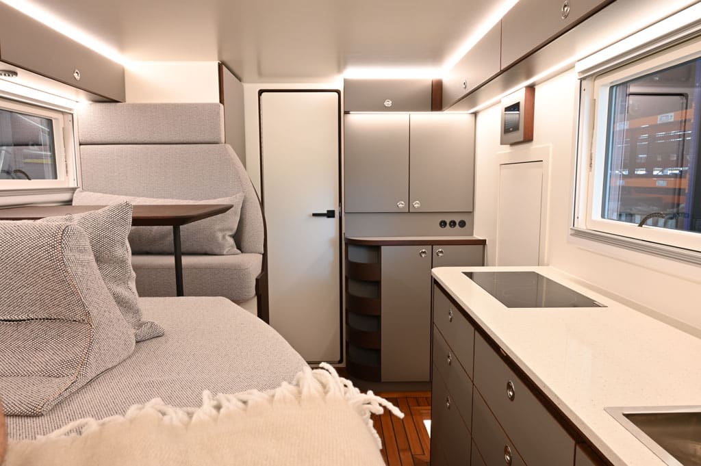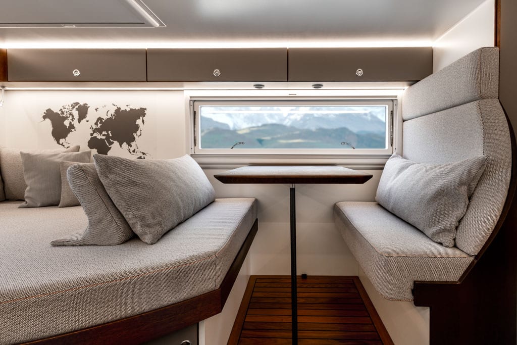 Eleganter Schnitt der Dinette, flache Oberschränke in der Wohnkabine des Unimogs sowie Polster aus sehr ansprechendem Stoff: Das Team von mogX zeigt viel Liebe zum Detail und guten Geschmack bei der Gestaltung eines gemütlichen Wohnraums im Weltreisemobil mogX.