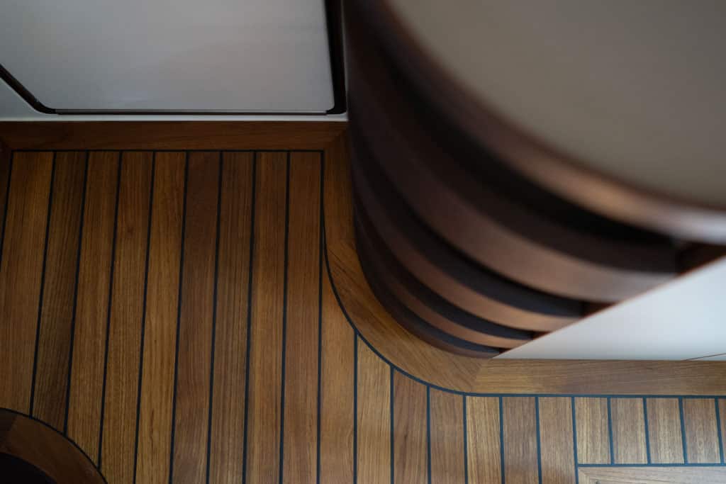 Schuhe bitte ausziehen: Der massive Echtholzboden wird zwar so manches Steinchen im Profil eines Schuhs verzeihen – doch einen derart edel und schön gefertigten Boden im Weltreise-Unimog mogX sollte man wirklich mit Respekt „betreten.“