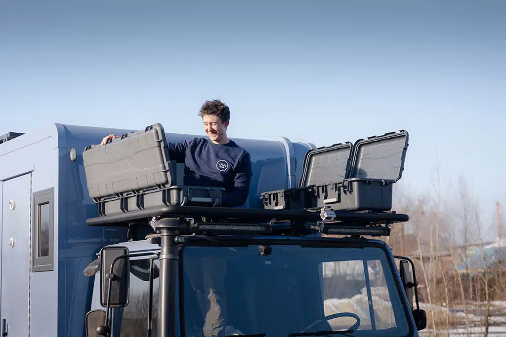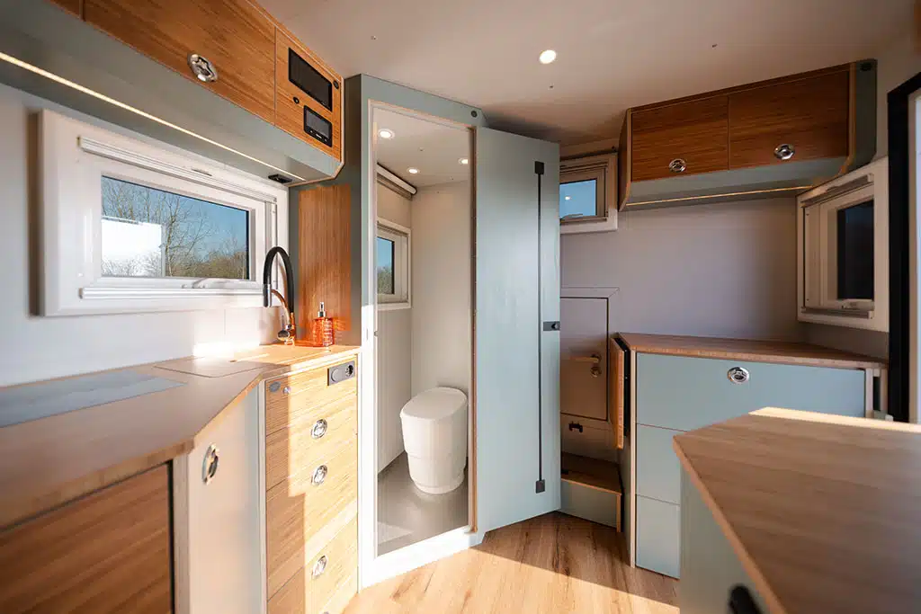 Die Kabine besteht aus 60 Millimeter starken GFK-Sandwichpaneelen und bildet die Basis für Stabilität und Isolation. Ergänzt wird der Aufbau durch Details, die vor allem für den Einsatz abseits klassischer Infrastruktur gedacht sind: zehn Echtglas-Expeditionsfenster, zusätzliche Stauboxen außen und auf dem Dach sowie ein beheizter Abwassertank mit elektrischem Ventil.