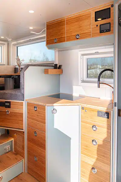 Details wie ein maßgefertigtes Schneidebrett mit eigenem Stauraum oder eine separate Abdeckung für die Spüle zeigen, wie alltagstauglich der Ausbau gedacht ist. Ergänzt wird die Küche durch einen Kühlschrank im Eingangsbereich sowie zusätzliche Arbeitsfläche über ein klappbares Modul.