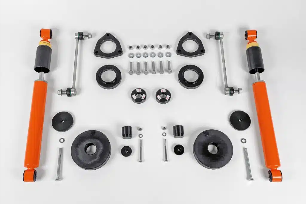 Offroad-Spezialist Terranger hat gleich verschiedene Varianten entwickelt, getestet und größtenteils abnehmen lassen. Von Vorderachse 30 Millimeter / Hinterachse 0 Millimeter bis 30 / 30 gibt es mit Zulassung. Die etwas gröberen Varianten 45 / 30 oder gar 45 / 45 besitzen keine allgemeine Zulassung – aber meist findet sich ein Prüfer, der die Teile im Fahrversuch §19.2 abnimmt. Das Ende der Fahnenstage ist also, dass 45 / 45 folgendes beinhaltet: Distanzplatten, über Domlager für die Vorderachs-Federbeine, aus hochfestem Aluminium, Oberfläche eloxiert; Distanzhülsen, unter Domlager für die Vorderachs-Federbeine, aus hochfestem Aluminium, Oberfläche eloxiert; Federwegsbegrenzer für die Vorderachs-Dämpfer aus Kunststoff; Koppelstangen für die Vorderachs-Stabilisatoren; Distanzkörper für die Hinterachs-Schraubenfedern aus glasfaserverstärktem Kunststoff; Verlängerungen der Zentrierung der Gummi-Unterlage für die Hinterachs-Feder, aus hochfestem Aluminium, Oberfläche eloxiert; Federwegsbegrenzer für die Hinterachse-Schräglenker, aus Kunststoff; und auch verlängerte Hinterachs-Stoßdämpfer.