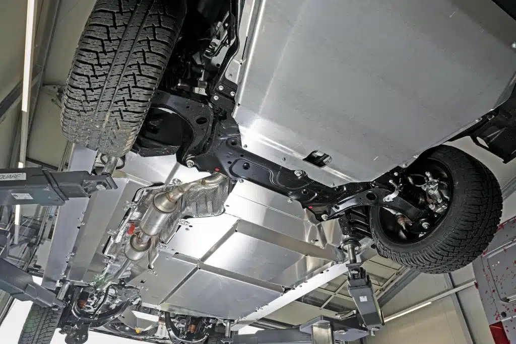 Bei den Höherlegungen trifft man oft auf den Zusatz, dass man dann größere Räder fahren kann. Können und dürfen sind aber zwei Paar Stiefel. 255/55R18 bringen nochmals gut einen Zentimeter mehr Bodenfreiheit, benötigen aber eine Tachoangleichung und Einzelabnahme. Ganz oben sieht es schon mal gut aus. Trotzdem ist ein bisschen Schutz und sonstiges Zubehör noch ganz sinnvoll – wenn man sich abseits befestigter Wege bewegen möchte.