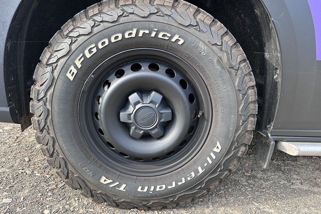 Wichtiger sind in diesem Fall die Offroad-Optionen die es bereits für den Ford und später auch für den VW gibt: Zum Beispiel der komplette Unterfahrschutz für Motor, Tank, Differential und die Rockslider für die Schweller. Dann noch die Höherlegung um 45 Millimeter und die All-Terrain-Bereifung. Auch wichtig dazu die Tachoangleichung und Bergeösen – falls der Luftdruck nicht abgesenkt wurde.