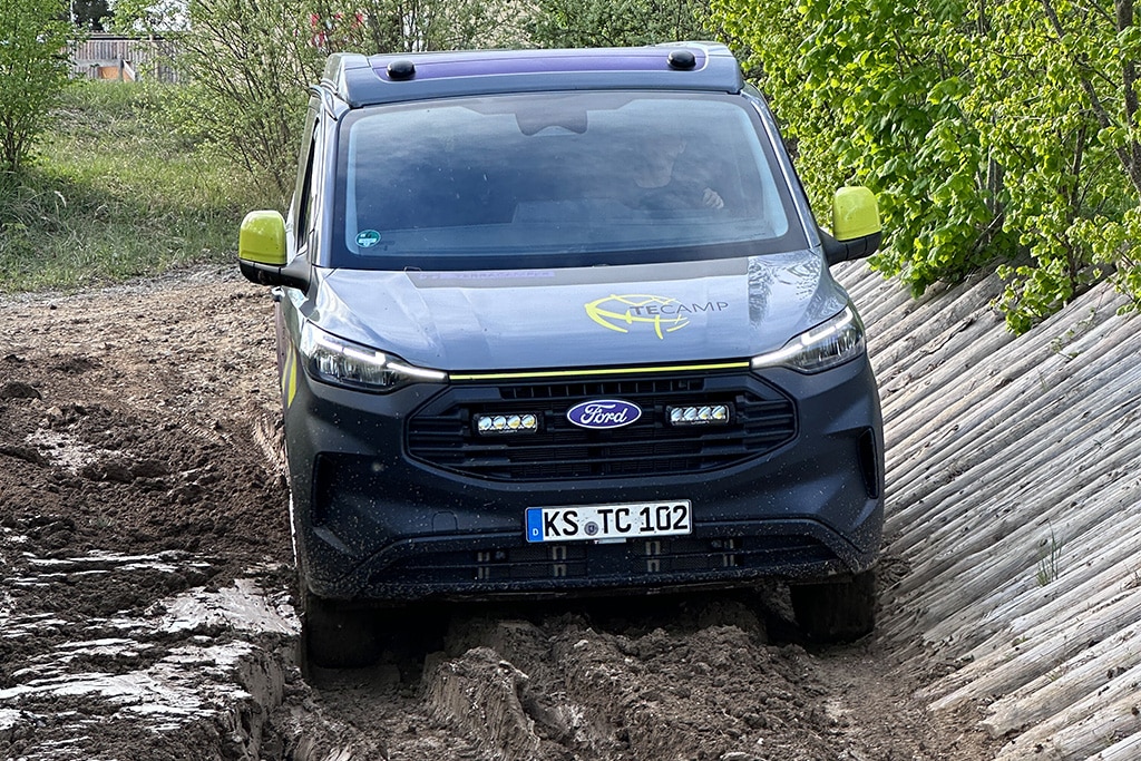 Egal, die Aufregung war groß. Die Überraschung, völlig unnötig. Nachdem die richtigen, besser gesagt die falschen, Assistenten ausgeschaltet waren ist der Tourneo völlig unbeeindruckt mit seinen 177 PS und der Wandlerautomatik über den Parcours gefahren. Selbst absichtliche Fahrfehler hat der Ford wieder ausgebügelt, schlimmstenfalls auf den zweiten Anlauf. Okay, die Teststrecke wurde immer einfacher, die Ideallinie immer trockener, aber selbst die absichtliche Fahrt in die letzten großen Schlammlöcher haben den TECAMP nicht gestoppt.