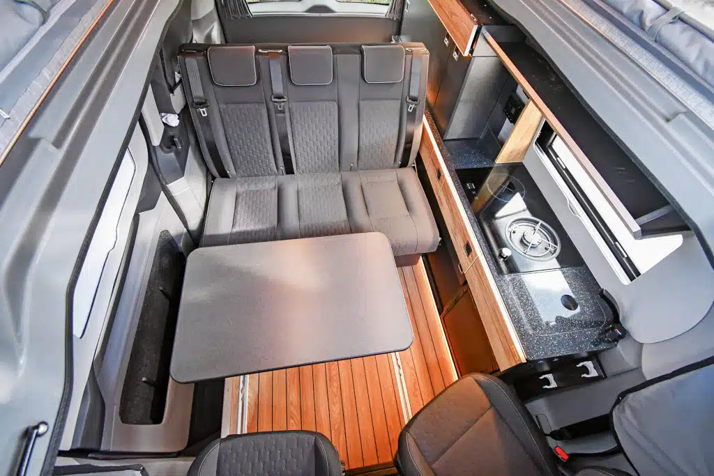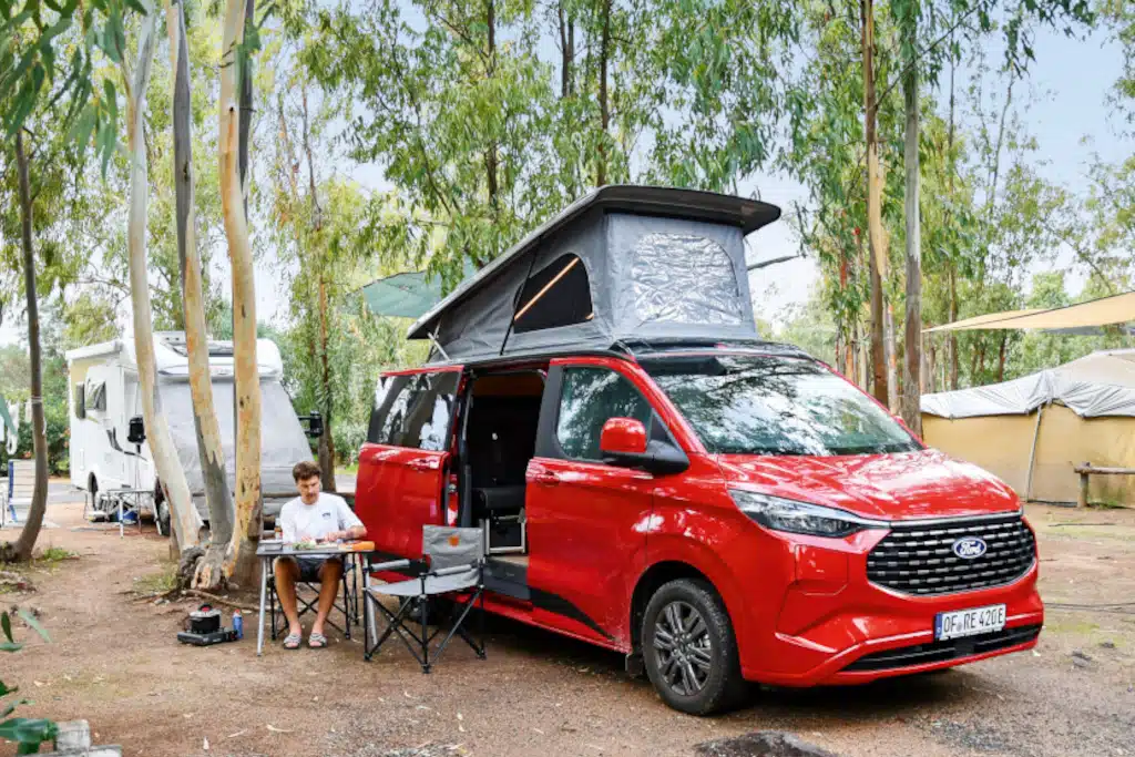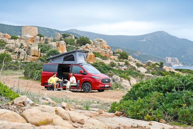 Das Hybrid-Kochfeld, das Aufstellfenster oder auch ein 12-Volt-Boiler sind durchaus selten im Segment der kompakten Campingbusse. Freilich spiegeln sich die vielen Extras auch im Preis wider, der für den Testwagen fällig wäre. Immerhin, beim größten Posten – dem Antrieb – ließen sich einige Tausend Euro sparen. Doch Achtung: Das gilt nur für den Ford. Beim VW ist der Top-Diesel etwas teurer und der eHybrid deutlich günstiger. Wie gesagt, es lohnt unbedingt ein vergleichender Blick in die technischen Daten.