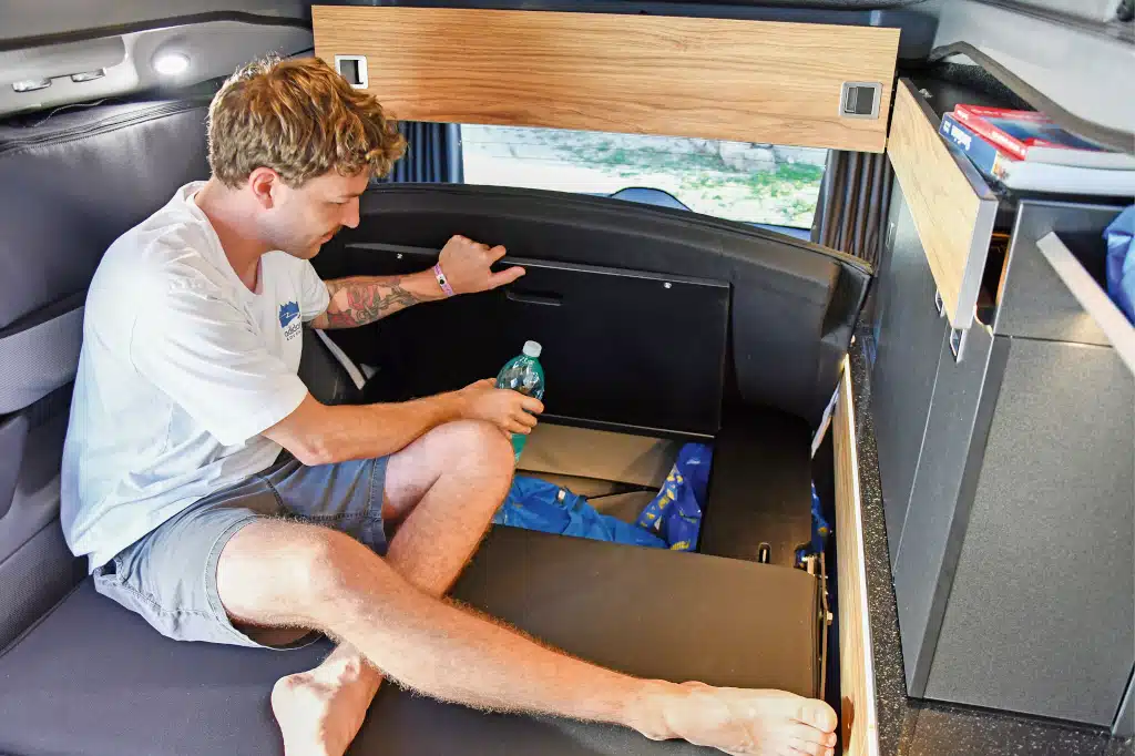 Über eine praktische Luke in der Bettenverlängerung erreicht man auch vom Wohnraum aus das Gepäck im Kofferraum – dieses Detail fehlt leider in vielen Campingbussen mit dem TrioStyle- Grundriss. Zum Durchladen von Skiern kann eine Blende entfernt, die große Schublade (65 mal 73 mal 20 Zentimeter) mit satten 30 Kilogramm beladen werden. An der Sitzbank wird auch der frei schwenkbare Tisch arretiert und nicht etwa an der Möbelzeile gegenüber, was quasi immer zu beengten Platzverhältnissen und versperrten Schubladen führt.