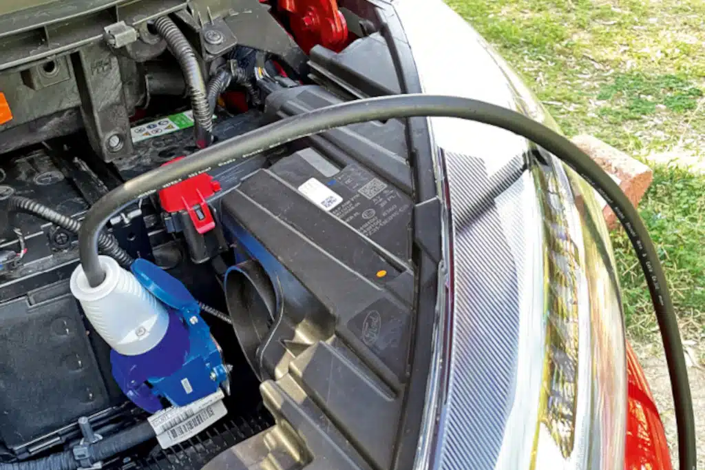 Da ist es doppelt schade, dass die Spaltmaße auch an diesem Ford (wir hatten bereits darüber berichtet) teils katastrophal ausfallen. Und im TrioStyle ist das nicht nur optisch ein Thema: Reimo legt den CEE-Anschluss in den Motorraum, und im Prinzip sind möglichst wenig Bohrungen in der Karosserie ja auch eine gute Idee. Allerdings entriegelt die Motorhaube (zweimal ziehen) längst nicht immer auf Anhieb und noch seltener, wenn man auf einem Auffahrkeil steht.