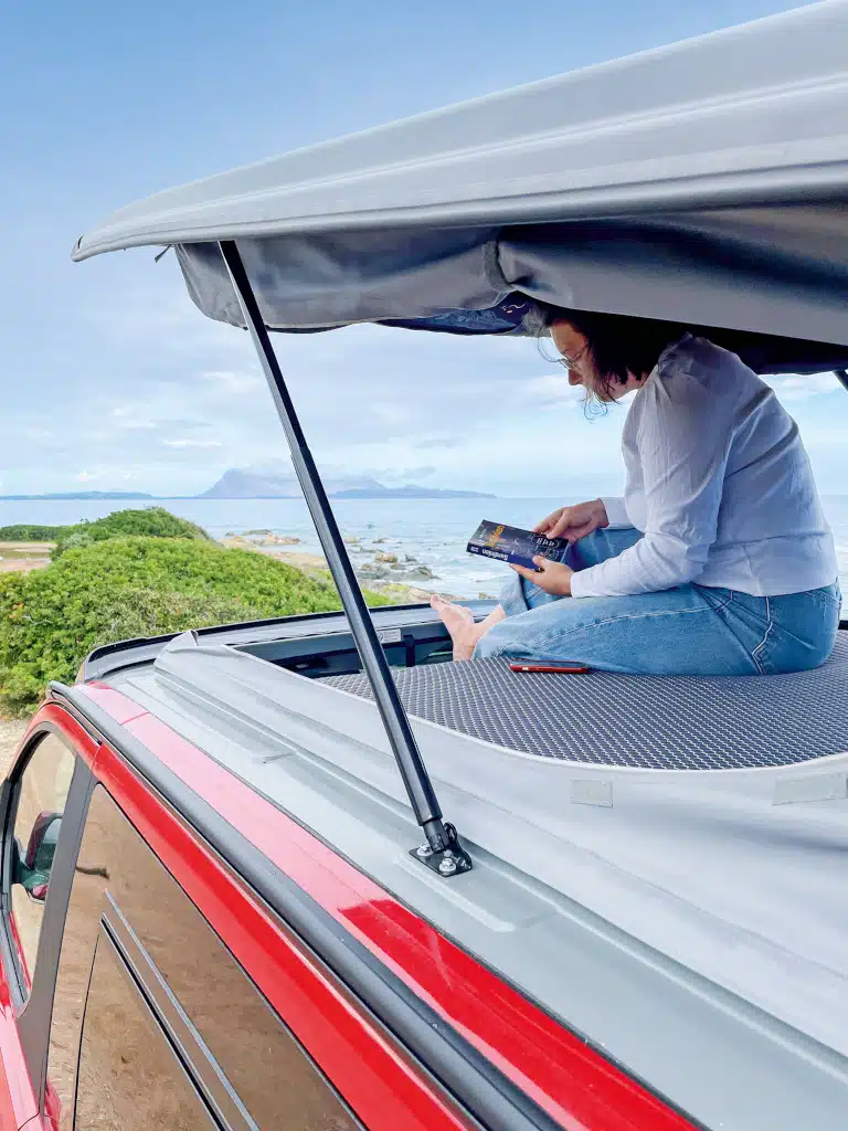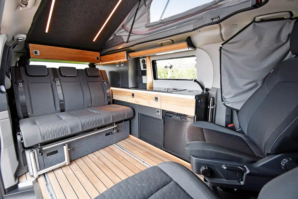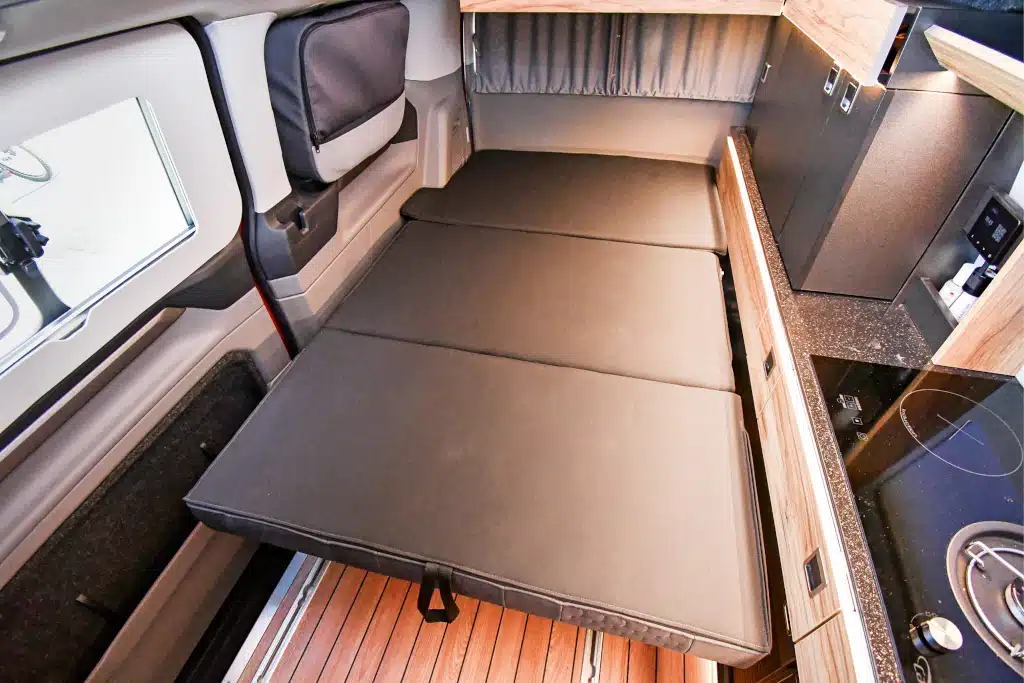 Ganz anders die Schlafsitzbank: Nach wie vor setzt Reimo auf die bewährte Variotech 3000 aus eigener Produktion. Weil man auf der Rückseite der konturierten Sitzfläche schläft, ist die Liegefläche eben und weich gepolstert sowie ohne störende Gurte, sodass kein Topper nötig ist. Gegenüber dem Vorgänger auf VW T6.1 konnte den die Bettenmaße sowohl im Dach, als auch der Klappbank marginal verbessert werden – aber natürlich ist mehr hier immer besser. Bei einer dreiwöchigen Reise klingen die bereits erwähnten, zusätzlichen zwölf Zentimeter im TrioStyle auf dem neuen VW durchaus verlockend.