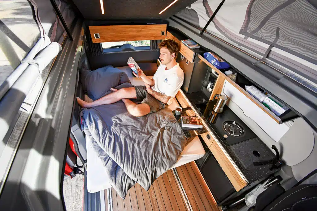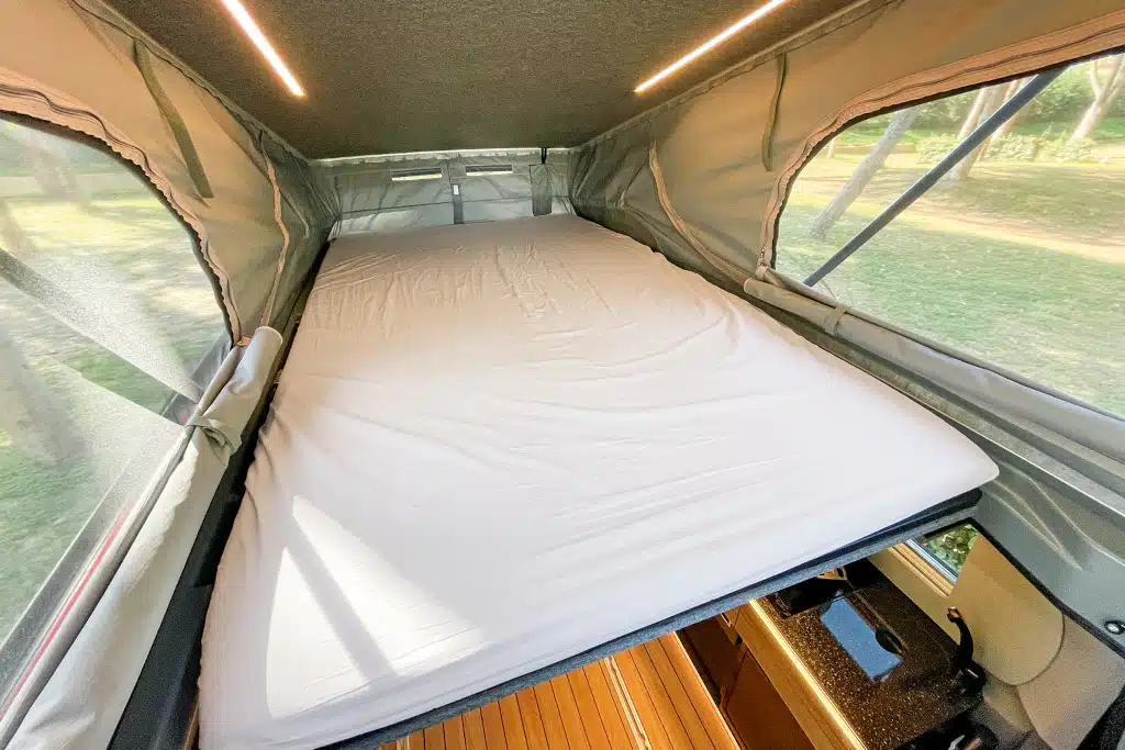 Auch LED-Lichtleisten sowie das „Luxusbett“ mit Tellerfeder-Lattenrost und einer fünf Zentimeter starken Matratze gehören zur Serienausstattung. Ob es nun an den verschweißten Alu-Latten des Rostes liegt oder an den Federtellern vom Hersteller Zomi – für unsere subjektive Wahrnehmung war der Schlafkomfort ein wenig enttäuschend.