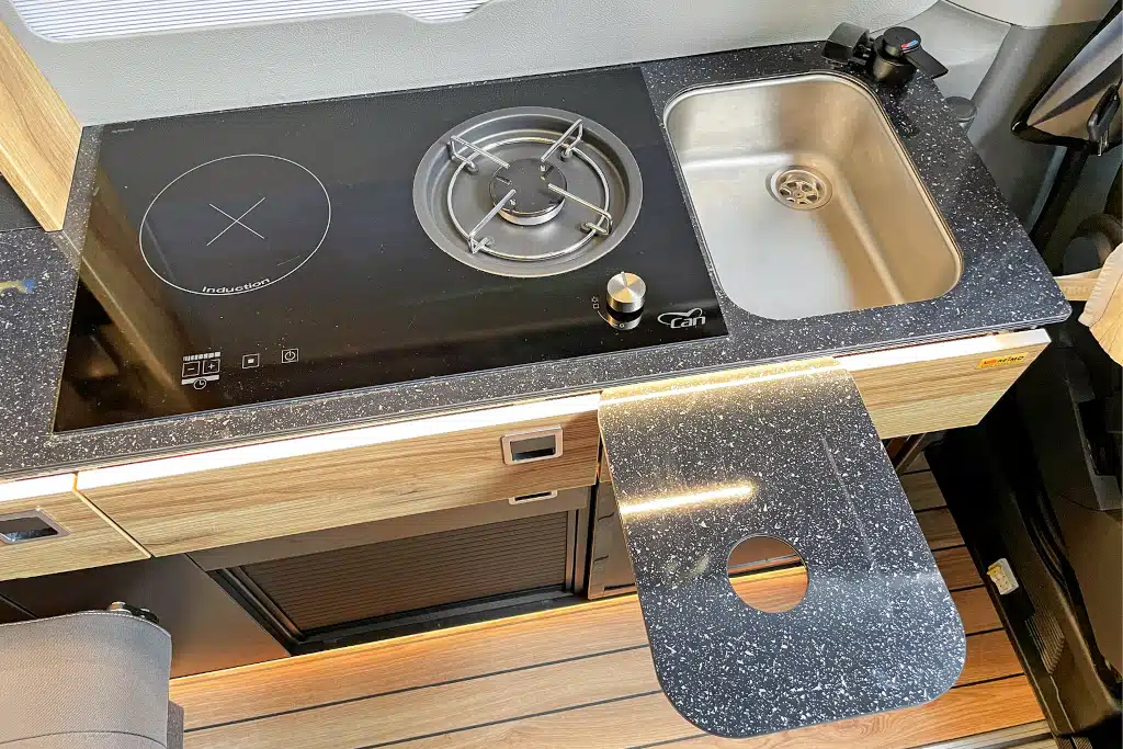 Der Küchenblock ist sinnvoll unterteilt, ein mobiler Gaskocher auf dem Induktions-Kochfeld ist eine praktische Ergänzung, wenn man mal abseits vom Landstrom steht.