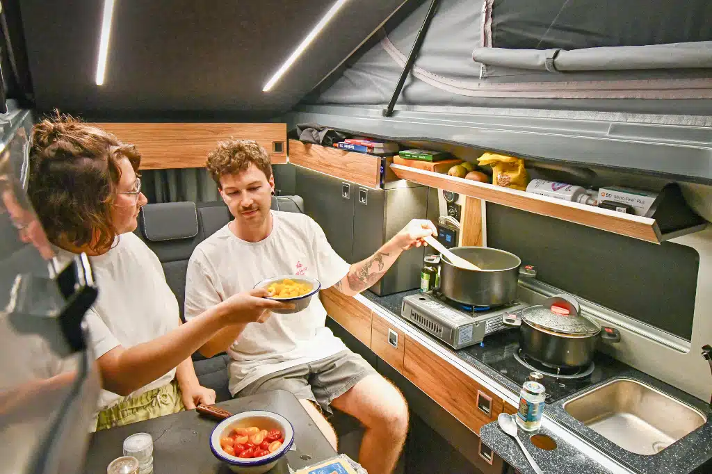 Das optionale Hybrid-Kochfeld von CAN ist spannend: Auf dem Campingplatz schnell, sauber und kostengünstig mit Induktion (1,5 kW) kochen sowie autark mit Gas (1,6 kW). Außerdem ist der Brennerabstand größer als beim Zweiflamm-Gaskocher. Allerdings: Der Gasbrenner ist etwas versenkt angebracht, falls mal etwas überkochen sollte. Jedoch muss deshalb zwingend darauf geachtet werden, keine Töpfe mit mehr als 20 Zentimeter Durchmesser zu verwenden, weil die Flamme sonst nicht genügend Sauerstoff bekommt. Trotzdem hat sich das hybride Kochfeld als sehr praktisch erwiesen und wäre uns den Aufpreis auf jeden Fall wert.