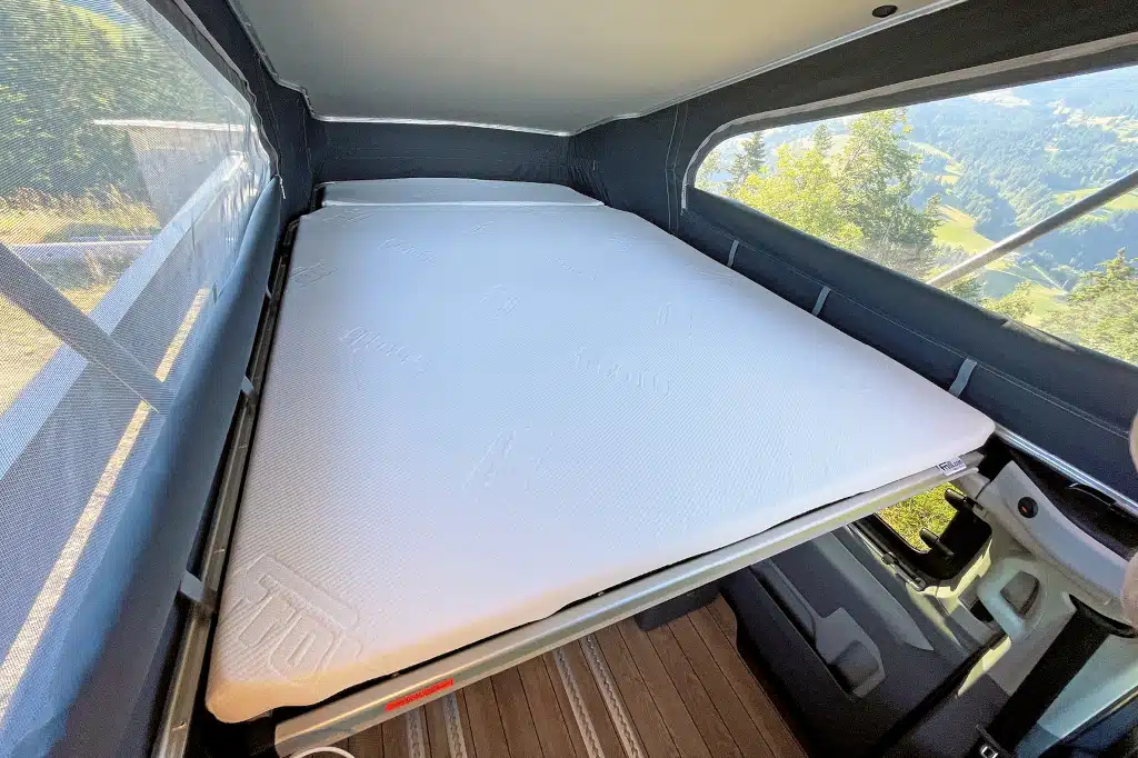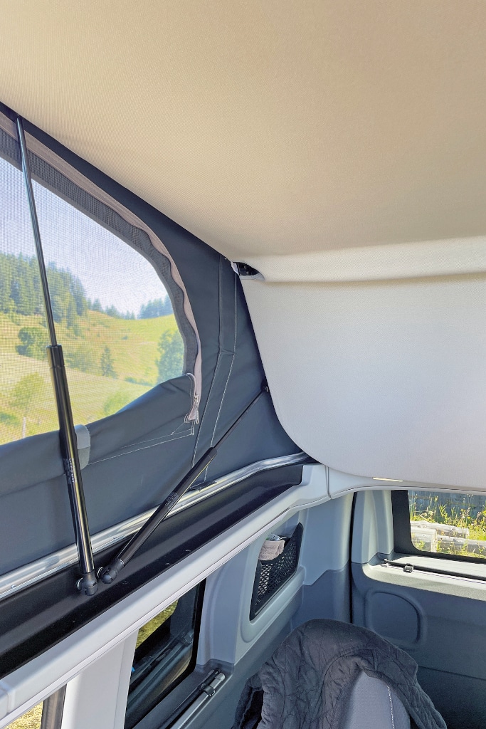 Durch die drei großen Fenster mit Fliegengitter gelangt viel Licht und Luft ins Fahrzeug. Das Dachbett mit Froli-Federtellern ist ausgesprochen bequem und groß obendrein. Dass die Matratze im Fußbereich wegen der Knickfunktion dünner ausfällt, ist in der Praxis nicht von Nachteil.