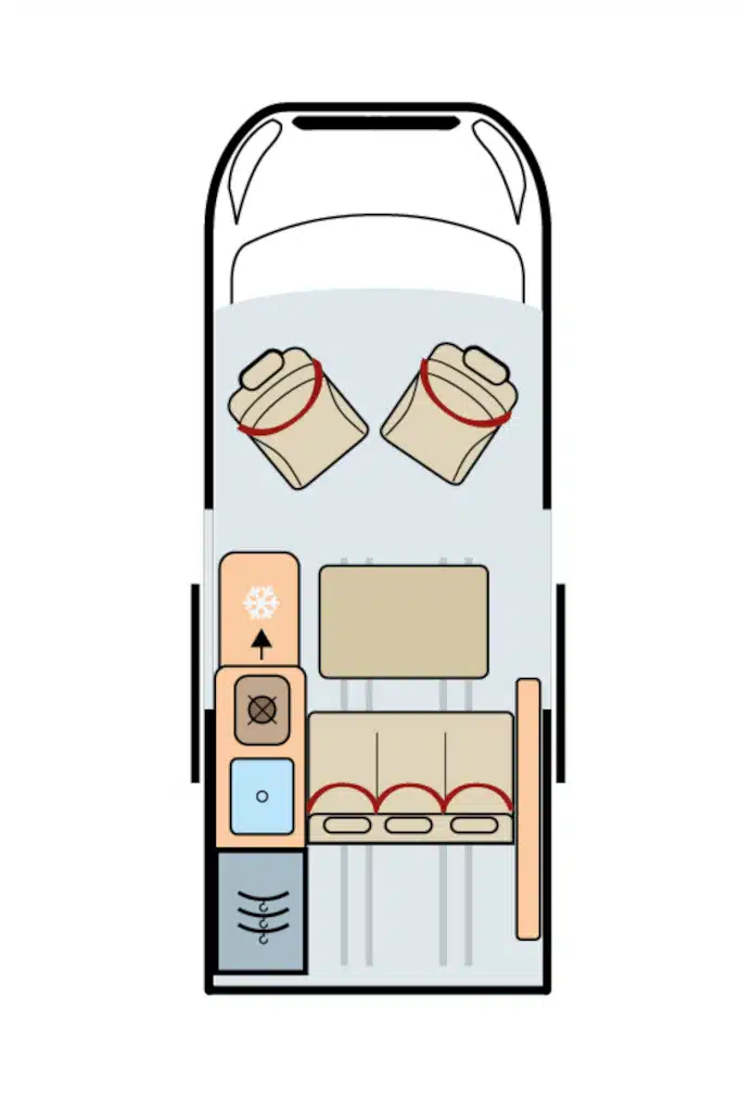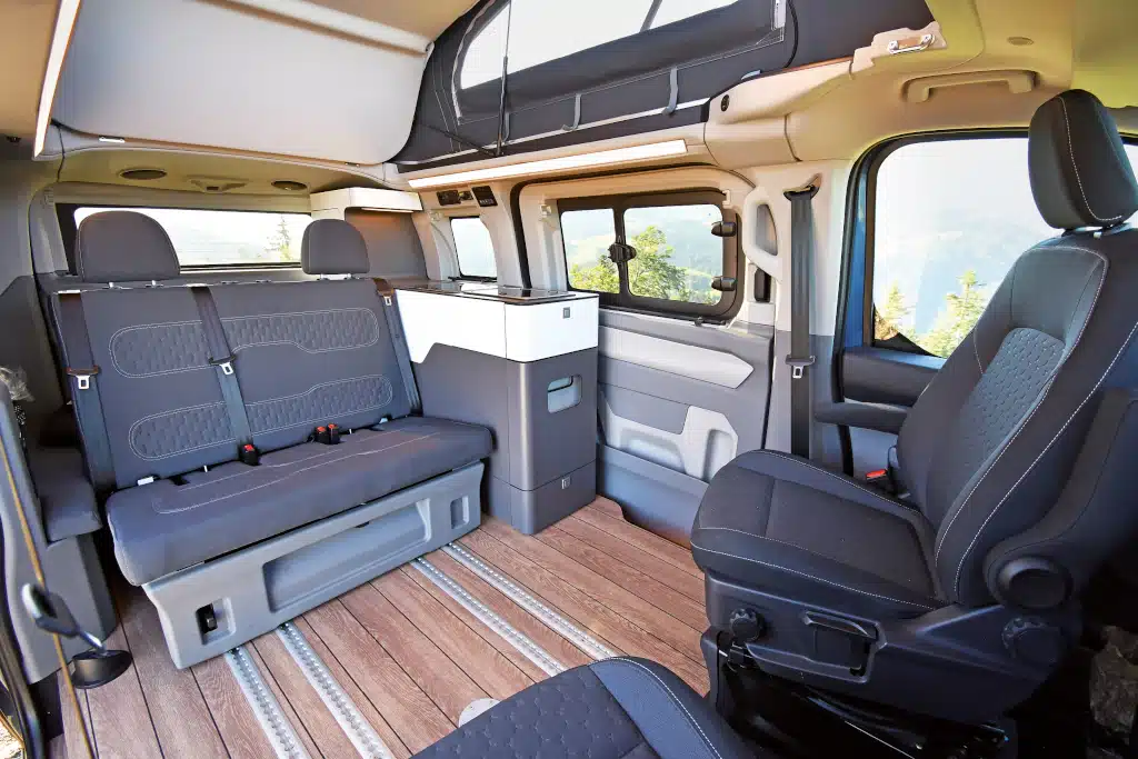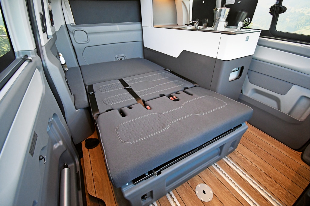 Die leicht verschiebbare Schlafsitzbank ist eine Entwicklung der Schwestermarke Westfalia. Auf 101 Zentimeter Breite bietet sie drei gurtgesicherte Sitzplätze und zwei Mal Isofix – der dritte Gurtplatz ist freilich mehr als Notsitz zu verstehen. Für längere Strecken sei die Sitzfläche außerdem zu wenig ausgeformt, und beim Beschleunigen und Bremsen ist etwas Spiel in Längsrichtung zu spüren, so das Feedback verschiedener Passagiere.