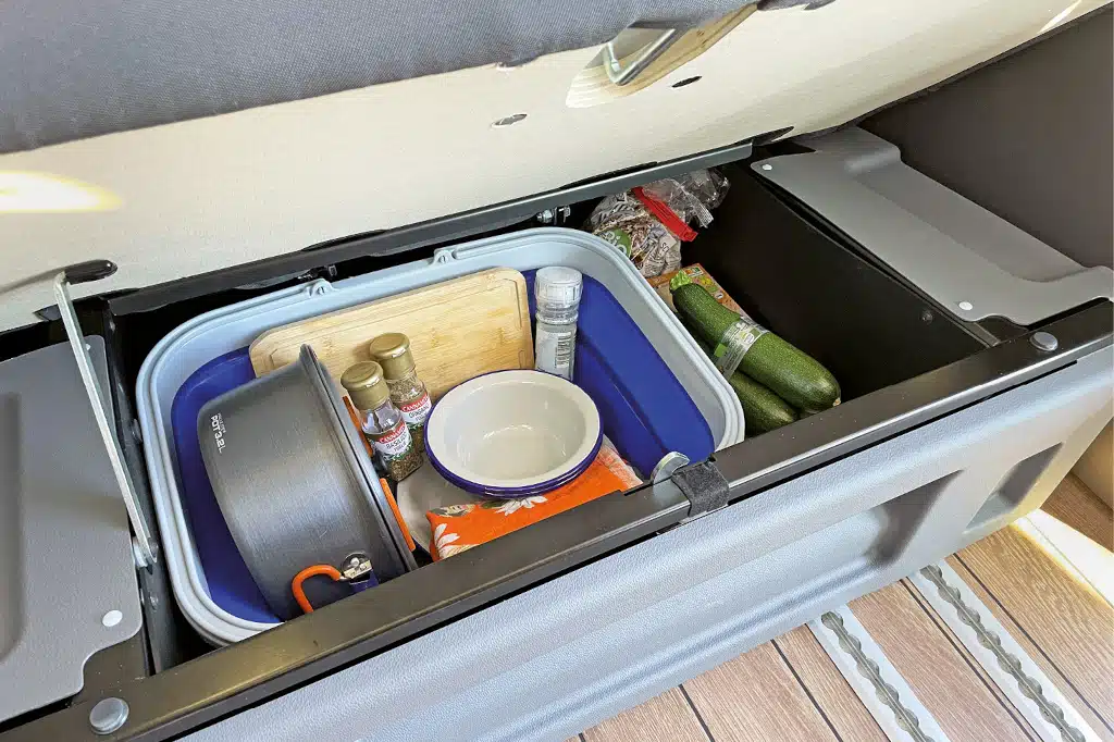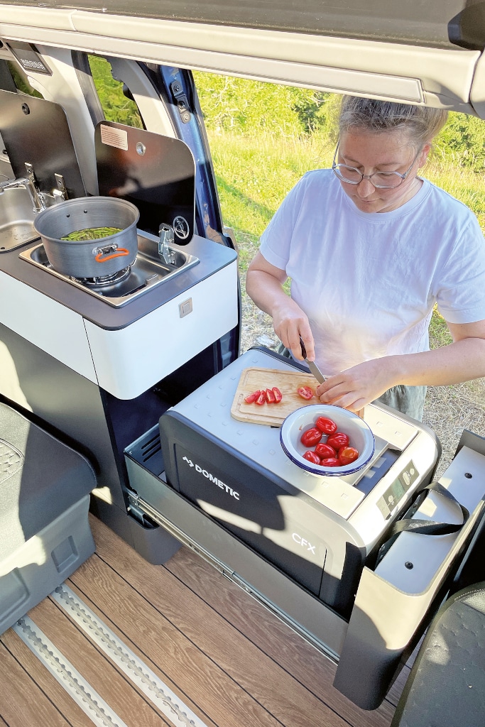 Beim Camping fällt die zweite Schiebetür besonders schwer ins Gewicht. Damit diese nutzbar ist, wurde die fahrerseitige Möbelzeile ordentlich eingekürzt – angenehme 62 Zentimeter misst der fahrerseitige Durchstieg. Der gewonnene Platz eignet sich gut, um dort nachts eine mobile Toilette zu stellen. Tagsüber fährt man die Schwerlast-Schublade aus, die mit einer 25 Liter fassenden Kompressor-Kühlbox von Dometic bestückt ist.