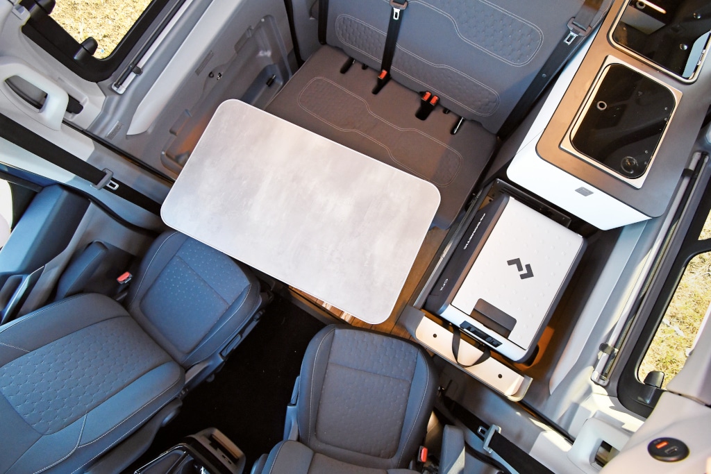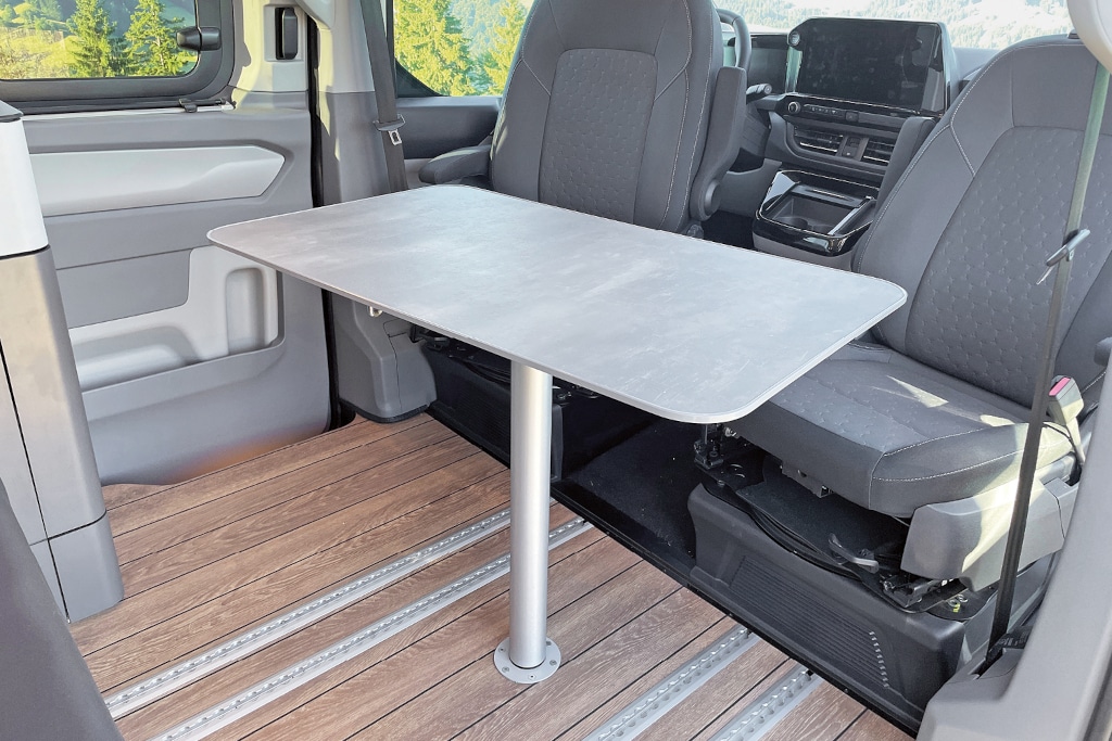 Um den Tisch im Fahrzeug zu verwenden, gibt es zusätzlich ein zentrales Tischbein, das fest im Fahrzeugboden verschraubt wird – dank verschiebbarer Bank kein Problem; der 86 mal 51 Zentimeter große Tisch ist fix aufgebaut, von jedem Platz aus gut erreichbar und steht sehr stabil. Gleichzeitig kann man sich dank zweiter Schiebetür unabhängig von einander bewegen.