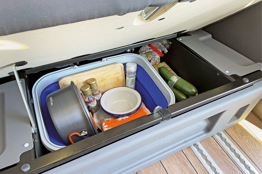 Die Box arbeitet angenehm leise, ihr Volumen genügt uns für ein langes Wochenende zu zweit. Aber man muss schon ein wenig wühlen – Kühlschränke sind doch übersichtlicher. Und beim Kochen muss man sich auf One-Pots beschränken: Nur eine Flamme (mit Piezo-Zündung) bietet das Kochfeld von CAN, der Topf sollte maximal 20 Zentimeter messen. Bei gutem Wetter empfiehlt sich zusätzlich ein mobiler Gaskocher. Der gekürzte Küchenblock bedeutet außerdem, dass einige wertvolle Staufächer entfallen. Im Citycamp gibt es zwei Schubladen, von denen eine fürs Besteck unterteilt ist, und ein 30 mal 30 mal 20 Zentimeter großes Staufach, über dessen Bodenblende auch der Wassertank samt Tauchpumpe zugänglich ist.