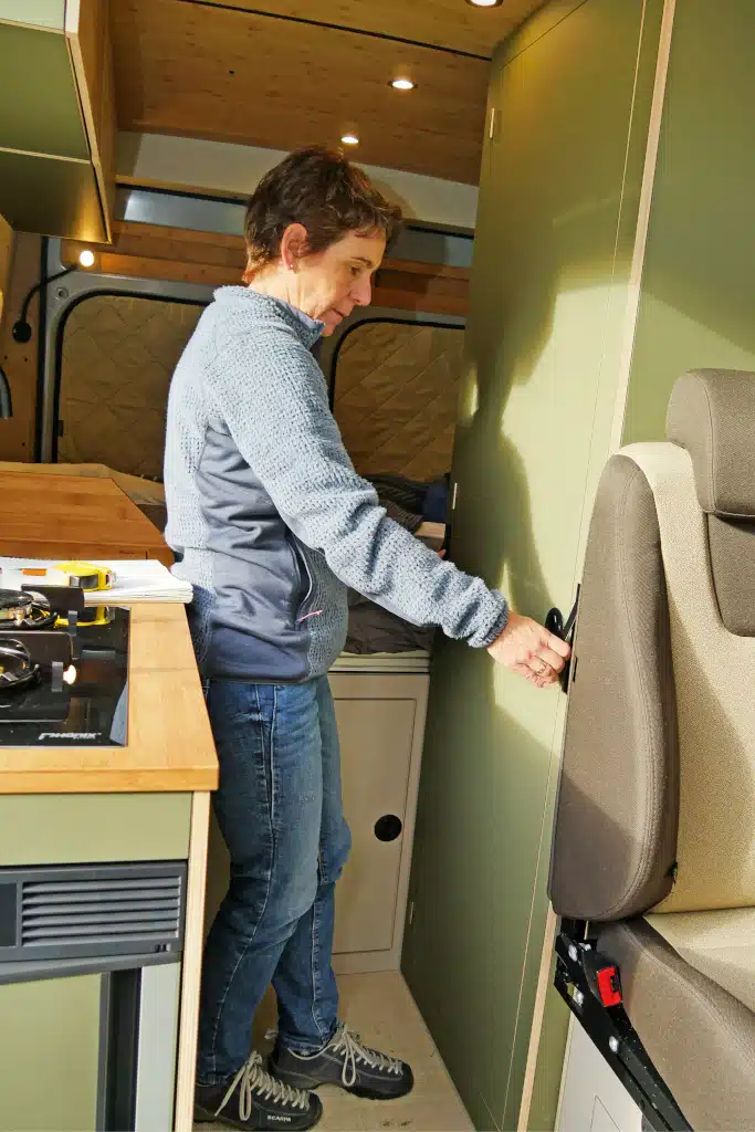 Nicht zu vergessen ist der geschlossene Hängeschrank, natürlich mit Rausfallschutz, den man auch dazubuchen kann. Die Oberschränke sind modular: Am Dach sind an beiden Seiten Airline-Schienen angebracht, an denen die Schränke mit Sterngriff-Schrauben befestigt sind. Man kann die Oberschränke also da anbauen, wo noch Platz ist. Es gibt sie nämlich auch für die Dinette und fürs Heck über dem Bett, gegenüber und in den Hecktüren sind praktische Fächer in der Verkleidung.
