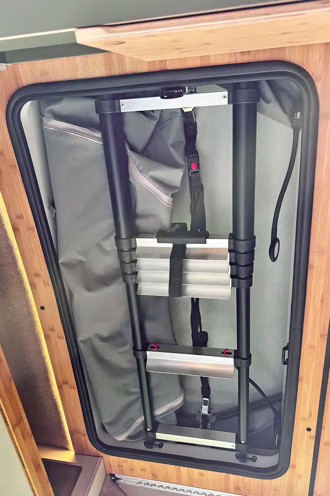 Wer die volle Kapazität ausnutzen möchte, braucht natürlich das Aufstelldach. Auch hier geht Kompanja den eleganteren Weg, denn die Leiter liegt nicht irgendwo herum, sondern ist schön aufgeräumt dem Durchstieg zum Dach eingepasst. Also einfach die Riemen lösen, die Leiter herunterklappen, das Dach öffnen und fertig ist der erste Stock.