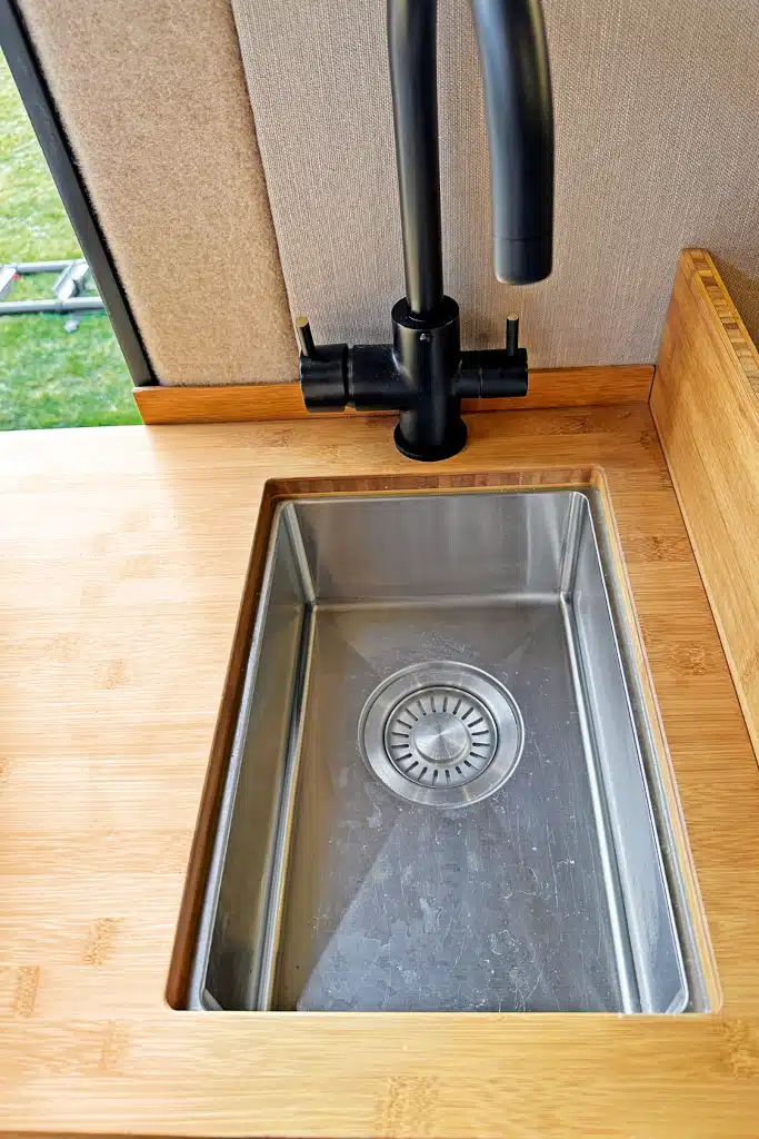 Solange jeder sein Becherchen und sein Tellerchen hat, gibt es Freigetränke aus dem Wasserhahn. Klingt komisch, ist aber so. Das Wassersystem mit einer Druckwasserpumpe hat nämlich eine Besonderheit: Klar, 90 Liter Frischwasser und eine Truma Combi 4, die elektrisch oder mit Diesel heizt, ist keine Sensation. Der Wasserhahn kann aber mehr.