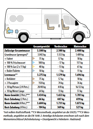 Maße und Massen: (L x B x H) 636 x 205 x 259 cm, Radstand 404 cm, Masse in fahrbereitem Zustand 3.106 kg (lt. Hersteller), Zulässige Gesamtmasse 3.500 kg