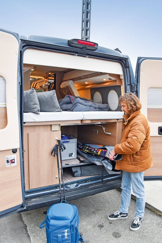 Da es an Stauraum nicht fehlt und die Gasstandheizung lautlos arbeitet, ist ihre Position unter dem Bett eigentlich kein Problem. Der winterliche Testbetrieb zeigt jedoch, dass der Schlafbereich deutlich wärmer wird als die Sitzgruppe – besser wäre es umgekehrt.