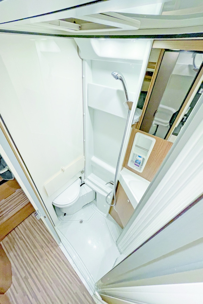 Das Bad mit wegschwenkbarer Toilette und Glieder- Schiebetür ist ein Traum für alle, die gerne im eigenen Fahrzeug duschen. Dafür müssen beim Stauraum Kompromisse in Kauf genommen werden, was mit Blick aufs gesamte Fahrzeug kein Problem ist. Auch das Putzen gestaltet sich durch die vielen Nischen aufwendig, und die Toilette steht etwas wackelig.