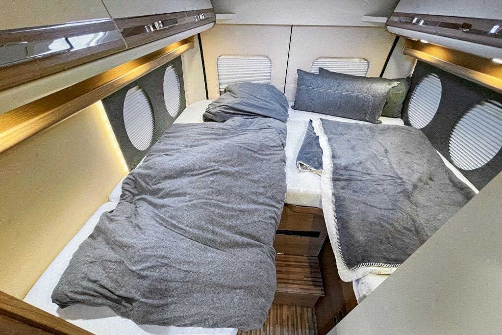 Auch die Stufe zum Bett wäre leicht zu verbessern: die dünnen Schrauben und Einschlagmuttern, die sie in Position halten sollen, wirken nicht sonderlich haltbar – zumal der Tritt als Stauraum dient. Über den Komfort der Längs-Einzelbetten mit zehn Zentimeter starker Matratze auf einem Holzlattenrost kann man wirklich nicht meckern. Wenigstens eine Seite misst knapp zwei Meter, bis zu den Wänden sind es sogar noch ein paar Zentimeter mehr. Die charakteristischen Bullaugen lassen sich mittlerweile beidseitig öffnen, die Verdunkelungsplissees an der gefährdeten Längsseite werden durch Holzblenden geschützt.