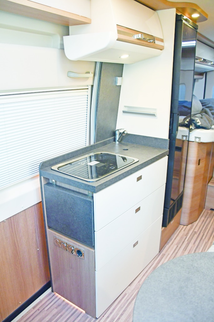 Eine Besonderheit ist definitiv der Thetford-Kühlschrank, und zwar schon ab Werk: Solche mit Absorbertechnik sind selten geworden im Segment der Kastenwagen, und Malibu platziert ihn ergonomisch günstig auf Griffhöhe. Allerdings verfügt der Testwagen über das Upgrade auf rekordverdächtige 138 Liter und Kompressortechnik (werkseitig: 80 Liter). Wer dieses Extra wählt, ist sicherlich perfekt aufgestellt, was die Lebensmittelvorräte angeht.