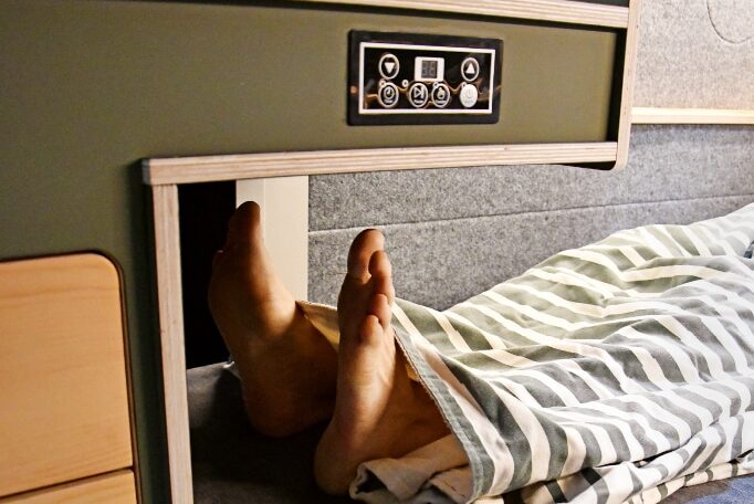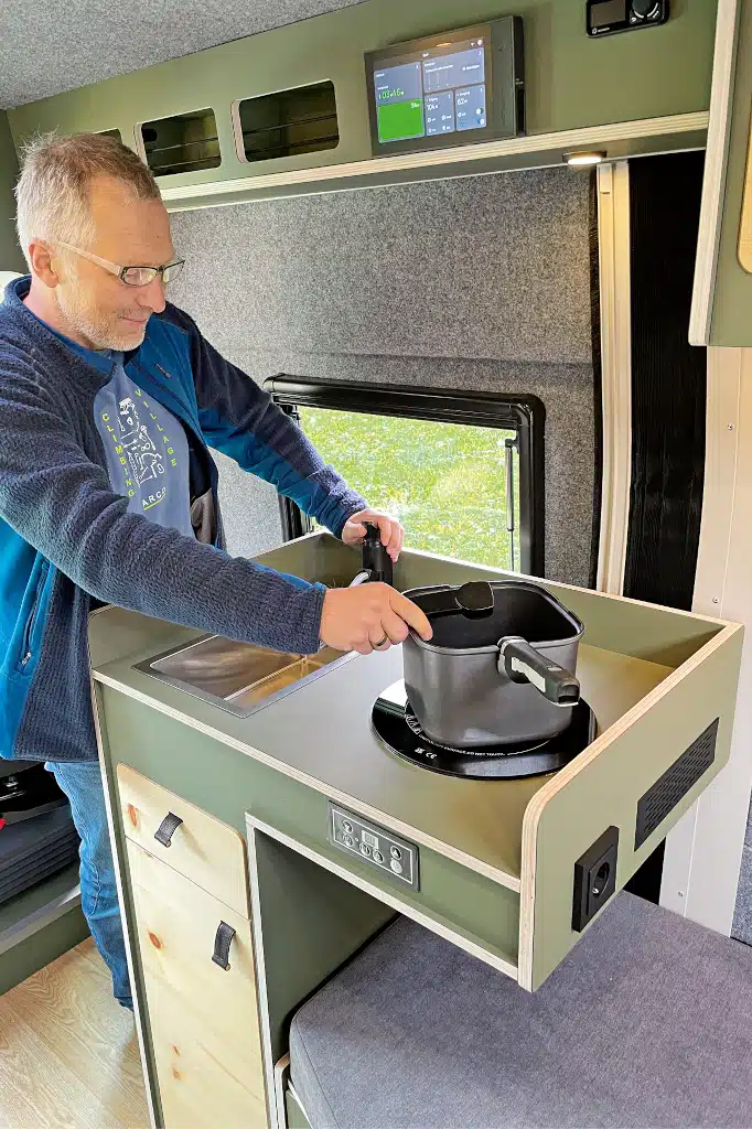 Ein bisschen gewöhnungsbedürftig ist, dass man die Füße jeweils unter dem Möbel einfädeln muss: auf der Fahrerseite unter dem Kühlschrank und auf der Beifahrerseite unter dem Kocher. Die 32 Zentimeter Höhe entsprechen immerhin Schuhgröße 50 – der Platz dürfte also genügen.