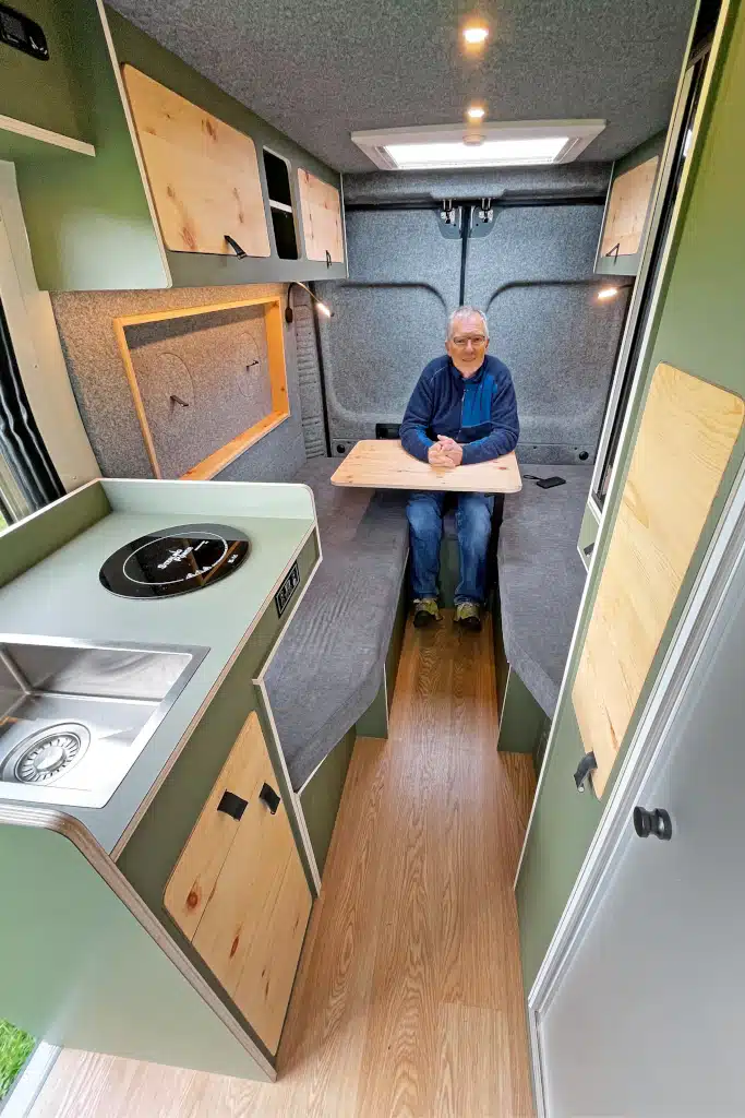 Okay, die Zirbe ist eigentlich nicht heimisch im Schwarzwald. Sie wächst bevorzugt in Regionen, die höher liegen als der Gipfel des Schauinsland. Trotzdem wirkt der Ausbau in Moosgrün und mit Klappen und Fensterrahmen aus echtem Zirbenholzfurnier sowie dunkel gefilzten Wänden absolut stimmig. Die Möbel lässt SüdBadenVan als Auftragsarbeit bei VanWeekend fertigen – ein erfahrener Partner, der sich auf Kleinserien und Nachrüstungen spezialisiert hat. Zum Einsatz kommen ausschließlich hochpreisige Materialien wie die Queenply-Leichtbauplatte oder der zertifizierte Kautschuk-Dämmstoff von Vanue.