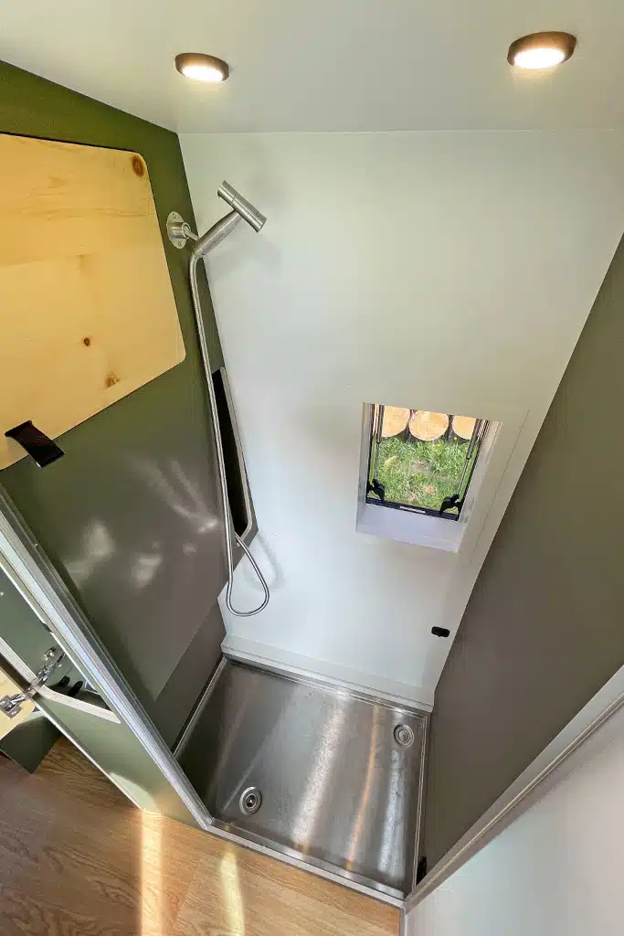 Ansonsten sehen die Eckdaten aber ganz gut aus: wasserabweisende, sauber verfugte Oberflächen, zwei einigermaßen sinnig platzierte Abläufe, eine sehr wertige Edelstahl-Brause und ein Fenster stehen auf der Haben-Liste. Auch etwas Stauraum, LED-Spots und eine spritzwassergeschützte 230-Volt-Steckdose fehlen nicht. Spritzwasser im offenen Staufach sollte man nach dem Duschen besser trockenwischen.