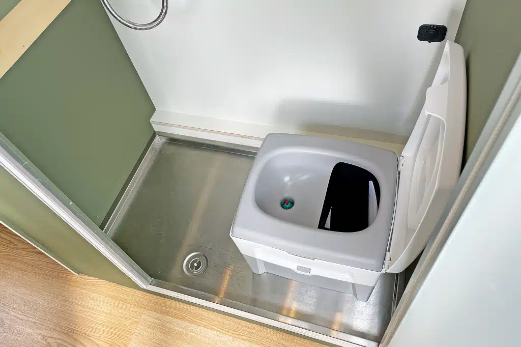 Serienmäßig ist die mobilen Trockentrenntoilette Trelino M an Bord. Sie ist aus Kunststoff (ABS) gefertigt und kann zum Duschen gut in der Nasszelle verbleiben, aber natürlich schafft man sich durch die mobile Lösung bei Bedarf auch mehr Platz.