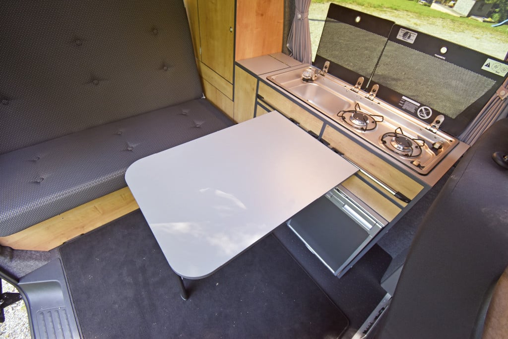 Kompressorkühlschrank (39 Liter) und die Kocher-Spüle-Kombination (zwei Flammen mit elektrischer Zündung) kommen von Dometic und bieten den üblichen Campingbus-Standard, neben der Spüle bleiben 22 mal 33 Zentimeter Ablagefläche. Wer gerne im Fahrzeug kocht, der sollte aber ein Schiebefenster bestellen.