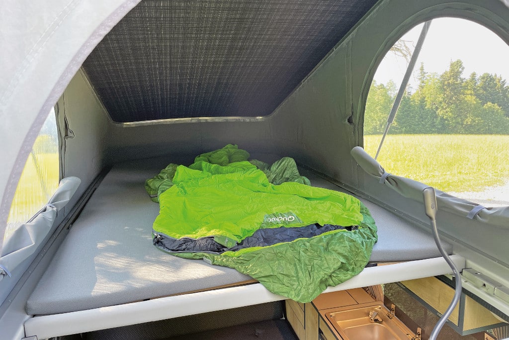 Den Spot gibt es im Aufstelldach, aber keine Steckdosen. Wie die Schlafsitzbank ist das Dach eine Eigenkonstruktion und aus eigener Fertigung. Summermobil setzt bei der in Wagenfarbe lackierten Dachschale und auch beim Verstärkungsrahmen auf einen glasfaserverstärkten Kunststoff, was das Gewicht trotz hoher Festigkeit niedrig hält. Dank C-Profil können Dachträger befestigt werden – dieses Feature fehlt bei einigen Mitbewerbern. Natürlich generiert der aufstellbare Lattenrost ausreichend Stehhöhe und außerdem eine 190 mal 110 Zentimeter große Liegefläche. Auch diese fällt recht bequem aus, und das trotz gerade einmal drei Zentimeter starker Matratze.