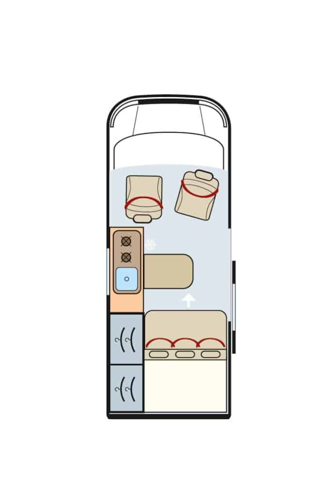 Bei Summermobil dreht sich viel um die eigens entwickelte Schlafsitzbank, die in den werksmäßigen Aufnahmepunkten des Transporters arretiert wird – verschiebbar ist sie nicht. Die 118 Zentimeter breite Bank bietet drei Sitzplätze ab Werk, zwei davon mit einem Becken-, einer mit einem Dreipunktgurt. Auf Wunsch verfügen alle Plätze über den Dreipunktgurt, und auch Isofix-Halterungen sind möglich, doch mit mehr als zwei Personen wird es eng.