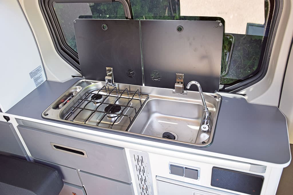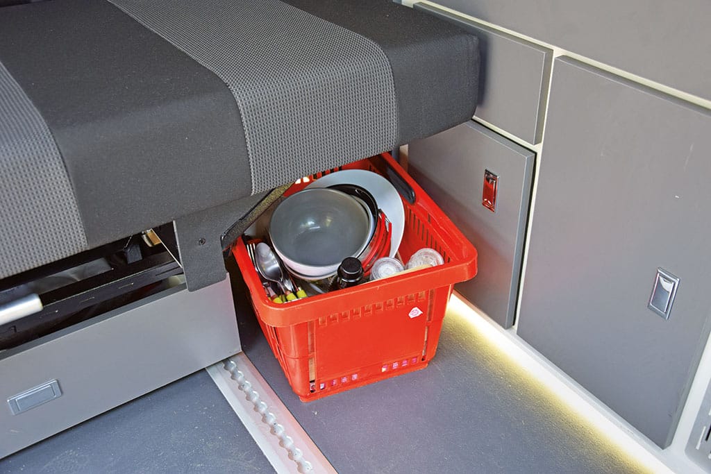 Nun könnte man argumentieren, dass sich die Außendusche nur mit entsprechenden Wasserreserven ordentlich nutzen lässt und zusätzliches Gepäck in Kisten im Heck des Van City transportiert werden kann – dafür muss die Sitzbank allerdings nach vorn geschoben werden, und dann lässt sie sich nicht mehr umklappen. Immerhin passen unser Einkaufskorb und eine Trenntoilette in die Durchlade zwischen Sitzbank und Möbel.