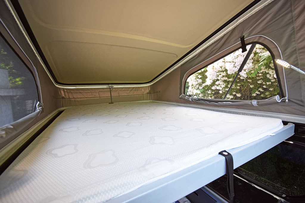 Wer hier regelmäßig übernachten möchte, wird eine dickere Matratze, einen Topper oder eine Unterfederung nachrüsten – tatsächlich wäre dafür sogar der Platz, denn bis zur geschlossenen Dachschale bleiben noch circa drei Zentimeter Luft. Wer mit der dünnen Matratze leben kann, hat hingegen den Vorteil, dass leichtere Bettdecken oder Schlafsäcke im geschlossenen Dach verstaut werden können.