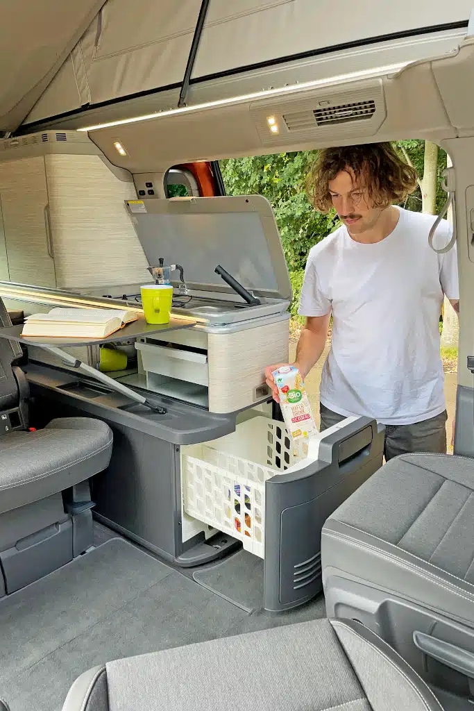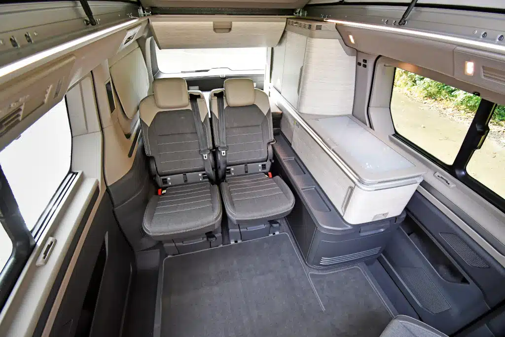 Auch Kochen mit Strom aus der Traktionsbatterie stand nicht im Lastenheft – dabei wäre ein autark funktionierendes Induktionskochfeld die perfekte Ergänzung für den neuen California, dessen gekürzter Küchenblock über nur noch eine Flamme verfügt. Stand heute funktioniert der Induktionskocher auch im eHybrid nur per Landstrom, weil die 230-Volt-Steckdose an der Aufbaubatterie hängt und maximal 300 Watt liefert. Auch hier bieten andere Fahrzeuge bereits mehr. Zum Beispiel stehen im New Transporter bis zu 2.300 Watt zur Verfügung.