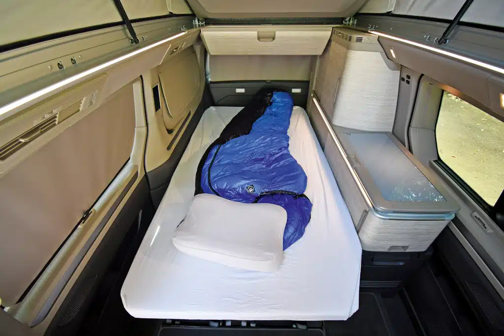 Gerade die Kühlfunktion ist eigentlich ein echter USP. Allerdings: Einen echten „Camping-Modus“, wie ihn einige Elektroautos bieten, gibt es nicht. Bei externer Stromversorgung ist die Standklimatisierung bis zu 30 Minuten aktiv; arbeitet sie allein mittels der Hochvoltbatterie, schaltet sie nach 10 Minuten ab. Geheizt wird dann ganz konventionell mit einer Benzinstandheizung von Eberspächer, die Klimaanlage könnte man zumindest immer wieder händisch einschalten.