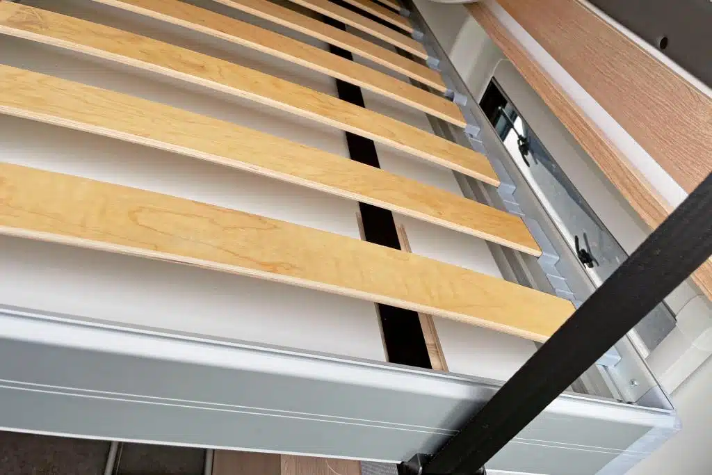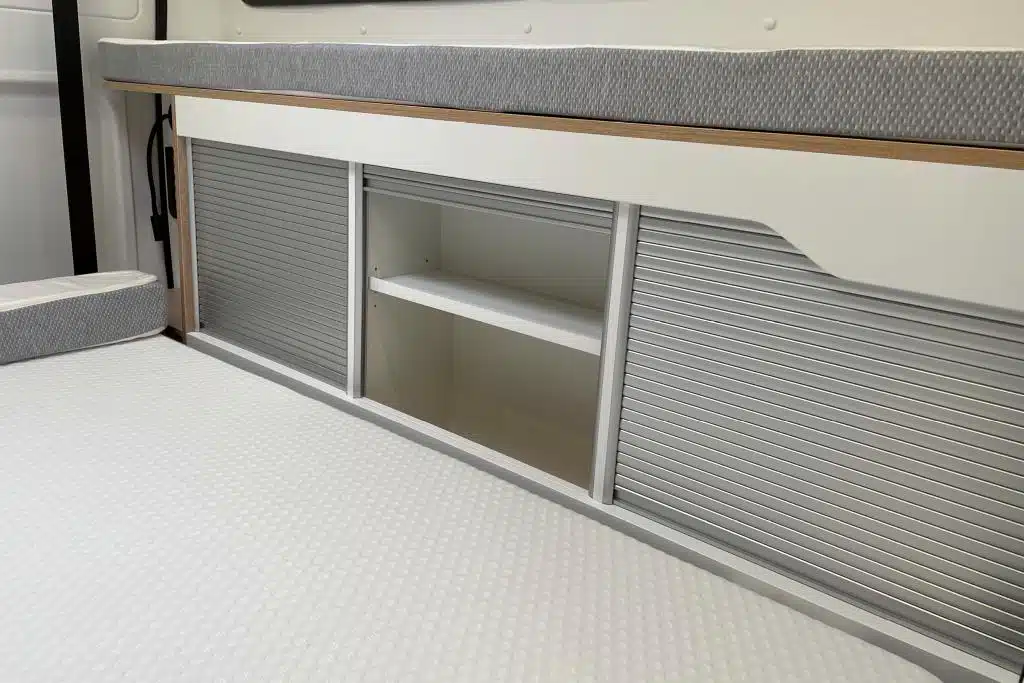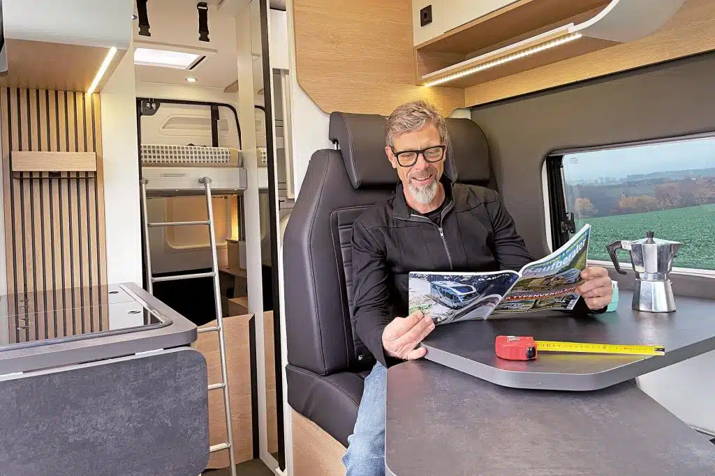 Einige Ablagen, Gepäcknetze sowie die Schrankwand mit geräumigen Fächern hinter Rolltüren bieten ausreichend Stauraum und ersetzen die klassischen Dachstauschränke. Auch LED-Leseleuchten und USB-Steckdosen fehlen nicht. Und zumindest der erste Eindruck von der elf Zentimeter starken Komfortmatratze, die auf einem Holzlattenrost ruht, ist absolut vielversprechend.