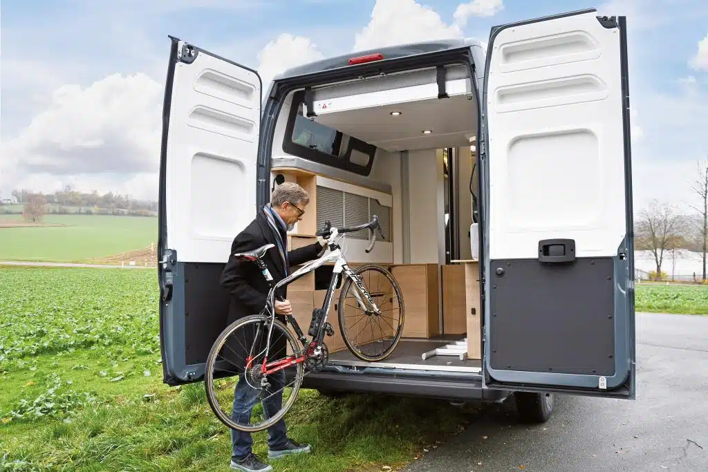 Unser Vorführ-Fahrzeug ist als Transportmeister, sprich ohne Zusatzbett konfiguriert. Der Laderaum ist maximal 197 Zentimeter hoch, 105 Zentimeter breit und 155 bis 195 Zentimeter lang. Das würde gut auch für ein Motorrad genügen, jedoch nur in der Theorie: Leider wurden die Zurrpunkte lediglich durch die Bodenplatte, nicht durch das Karosserieblech verschraubt. Da sollte der Hersteller nachbessern. Leichtere Sportgeräte sind aber auch in doppelter oder dreifacher Ausführung kein Problem – lange Surfbretter lädt man bei entnommener Schottwand ganz einfach bis in den Wohnraum durch.