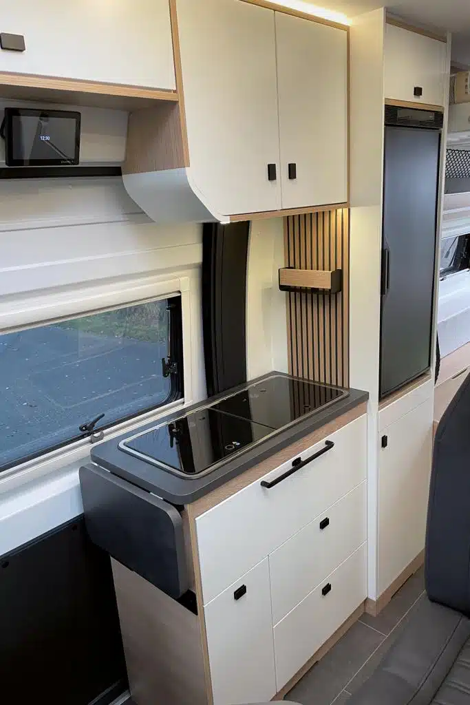 Den kompakten Küchenblock gegenüber ergänzt ein deckenhohes Möbel, in dem auch der Kompressor-Kühlschrank unterkommt. Top: Der Thetford-Kühlschrank befindet sich auf Augenhöhe.