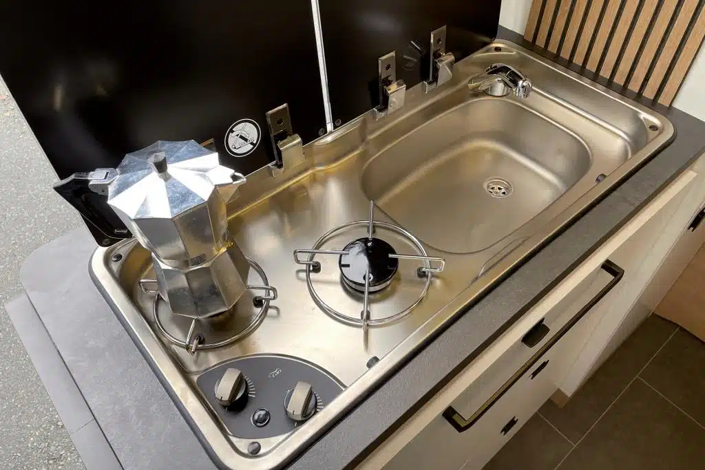 Eine Kocher-Spüle-Kombination mit elektrischer Zündung und Einhandmischer komplettiert die Ausstattung. Wie fast immer bei solchen Kombigeräten fällt der Abstand zwischen den beiden Gasbrennern recht gering aus (20 Zentimeter), sodass höchstens mittelgroße Töpfe gleichzeitig befeuert werden können.