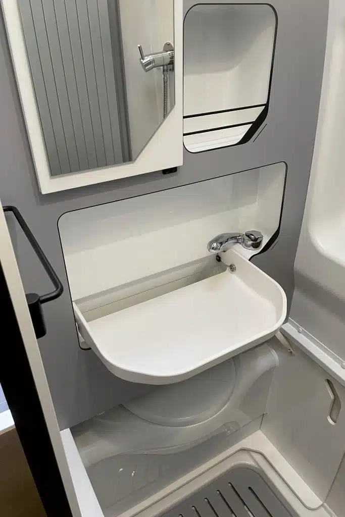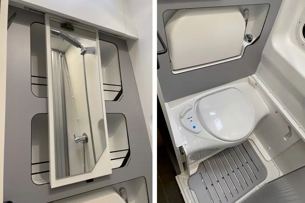 Zur Fahrerseite betritt man durch eine platzsparende Glieder-Schiebetür eine kompakte Nasszelle. Dass auf nur 83 mal 83 Zentimetern Grundfläche genügend Platz zum Duschen bleibt, liegt insbesondere an der verschiebbaren Banktoilette, aber auch am klappbaren Waschbecken. Außerdem ist die gesamte Baugruppe (Möbelbauplatten aus CPL und Kunststoff-Formteile) wasserabweisend, sodass auf einen Duschvorhang verzichtet werden darf. Trotzdem fehlt es auch hier nicht an Ablagen und Staufächern.