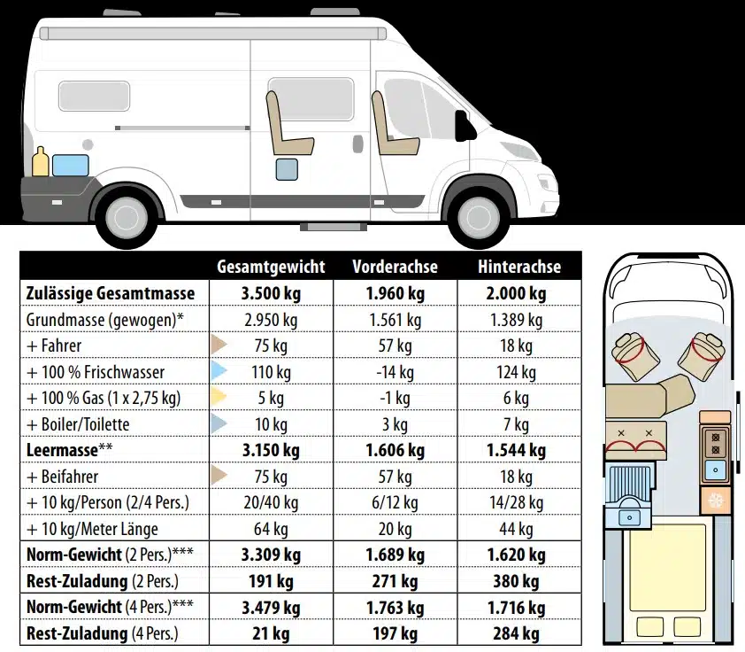 Obwohl im Grundpreis nicht ganz günstig, bei 200 Ah Lithium, zwei Solarpanelen, einem Pioneer-Naviceiver, der Markise, Rahmenfenstern rundum und der großen Diesel-Elektro-Standheizung von Truma hält sich das Preis-Leistungs-Verhältnis durchaus die Waage. Unterm Strich und durch das XL-Format bietet der Yucon 63 H sogar richtig viel Campervan fürs Geld. Je nach Nutzung lohnt noch ein Blick auf die Gewichte, die wir in der Ladetabelle (rechts) aufgedröselt haben.