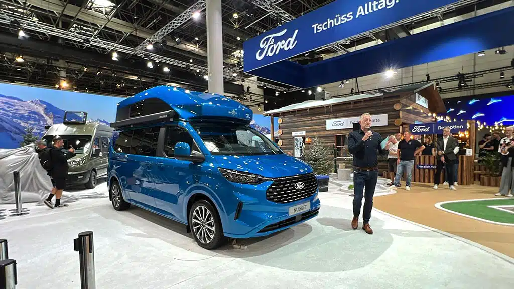 Auf dem Caravan Salon 2025 zeigt Ford den Nugget Titanium mit festem Hochdach: Mehr Platz, neue Bettmechanik mit Gasdruckdämpfern, zwei Grundrisse, bis zu 911 Liter Stauraum und optimierte Ganzjahres-Tauglichkeit.